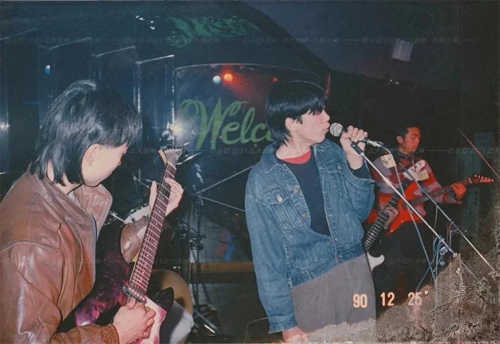 青铜器乐队在外交人员大酒家的演出,照片的日期显示为1990年12月25日。左起:戴涛(吉他),老狼(主唱),白方林(吉他)。当时鼓手为陆费汉强、贝司许宁峰、键盘赵伟。