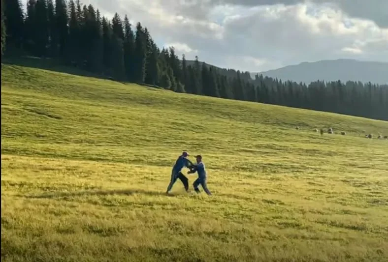在那拉提草原摔跤的哈萨克男孩 / 截图自老狼的视频号