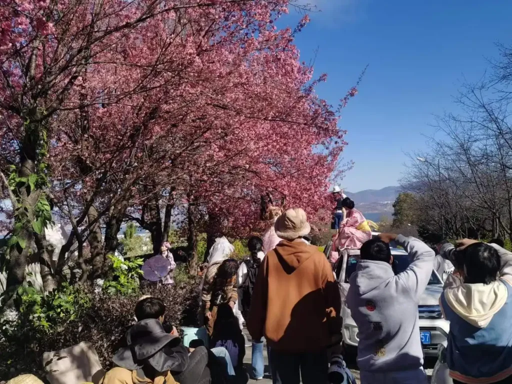 大理冬樱盛开,人们挤在树下占机位拍写真。图/九派新闻 王怡然